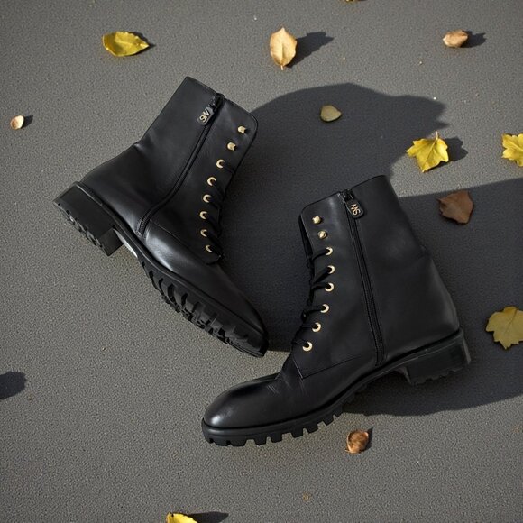 Crafted from premium black leather, these Stuart Weitzman Laine boots feature a stylish combat design with lace-up detailing. Perfect for any casual or edgy outfit, they offer both comfort and durability.