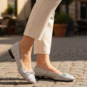 STUART WEITZMAN Leather Ballet Flats 8 Geometric Bows Stone Low Pile Suede RARE