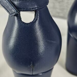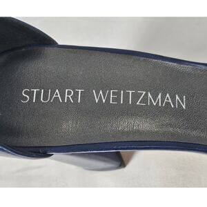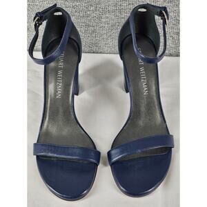 Elegant Stuart Weitzman NearlyNude sandals in rich navy blue with a block heel and minimalist ankle strap. Style blends timeless sophistication with modern comfort.