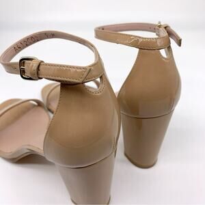 Stuart Weitzman Nudist 75 Block Heel Sandal in patent nude. Classic style, single strap over the toes, thin ankle strap. Tall block heel, little keyhole at the back of the ankle. Good condition!