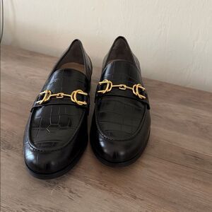 STUART WEITZMAN- Owen Croc-Embossed Leather Bit Loafers- Black&Gold