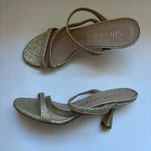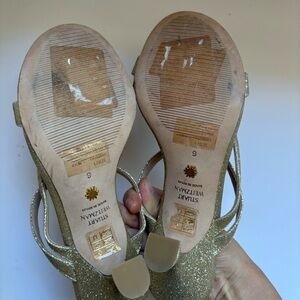 Stuart Weitzman glitter fabric sandals Open toe Adjustable ankle strap Leather outsole Lining: Leather Made in Spain 3 2/5" heel