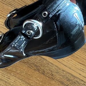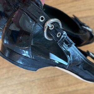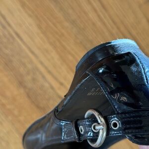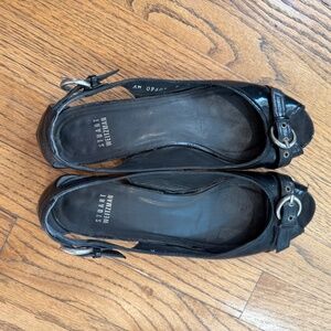 STUART WEITZMAN PEEP TOE BLACK PATENT LEATHER BALLET FLATS