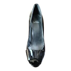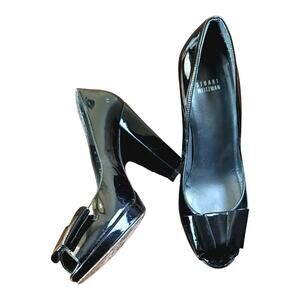 STUART WEITZMAN Peep Toe Patent Leather Stacked Block Heel Pumps with Front Bow