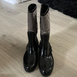 Black Rubber Stirrup Buckle Stylish black and silver glitter rain boots. Perfect for a rainy day. In excellent condition. Size 8US Size 39EU