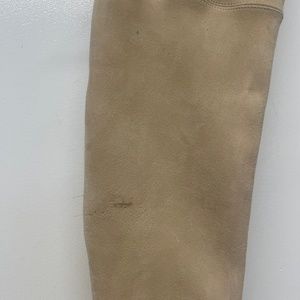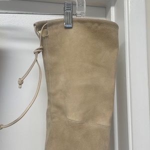 Light cream/beige suede. Ties at the tops. Wood stacked heel measures just under 4". Shaft is approx 23.5".