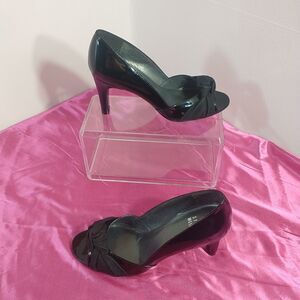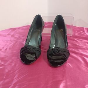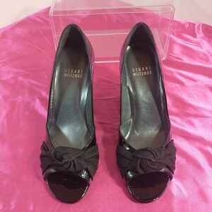 STUART WEITZMAN SZ 4M Black Patent Leather Pumps With Fabric Front Bows.