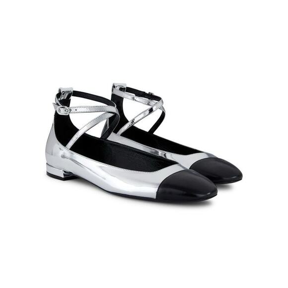 STUART WEITZMAN Silver & Black Cap Toe Leather Eden Cross-Strap Ballet Flats 7.5