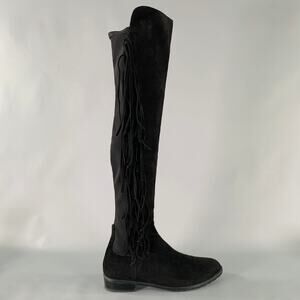 STUART WEITZMAN boots in a black suede with stretchy nylon panel featuring a knee high style, fringe design, and pull on closure. Comes with dust bag. Made in Spain.