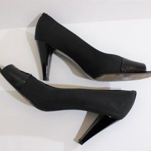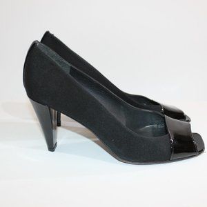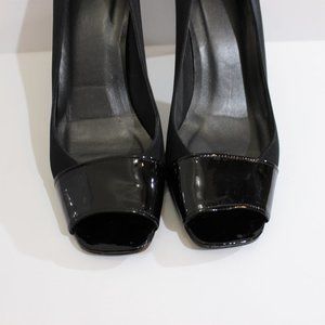 Stuart Weitzman Black Textile and Patent Leather Peep Toe Pumps