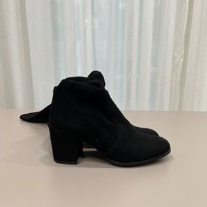 Authentic Stuart Weitzman Tieland boots in color black, size 8 US. Material Suede, block heel 70mm, classic almond toe, stretch construction.