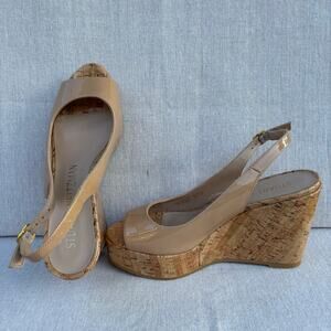 STUART WEITZMAN Wms Sz 7.5 Nude Patent-Leather Cork-Wedge Pumps 3.8" Heels SPAIN
