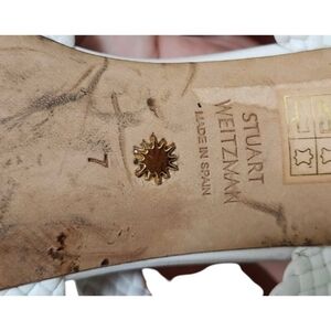 Experience the perfect blend of comfort and style with these Stuart Weitzman woven padded sandals. Crafted for the discerning woman, these sandals feature a luxurious leather upper in a crisp white hue, making them a versatile addition to any summer wardrobe. The strappy design not only elevates the visual appeal but also ensures a secure fit, while the padded feature offers unparalleled comfort for all-day wear. Sized at a generous 7, these sandals are an embodiment of elegance and practicality, ideal for any occasion that calls for a touch of sophistication.