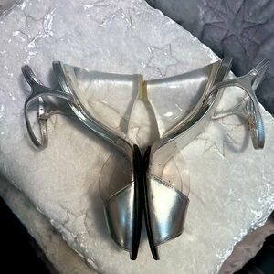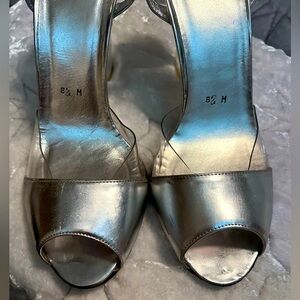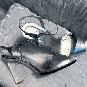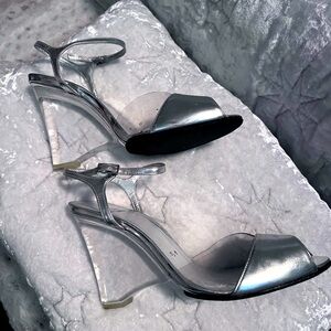 STUART WEITZMAN Y2K SILVER W/LUCITE WEDGE SANDALS SIZE 8.5