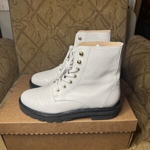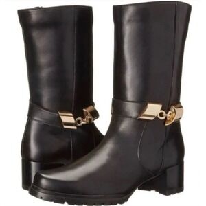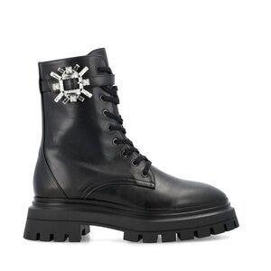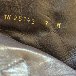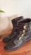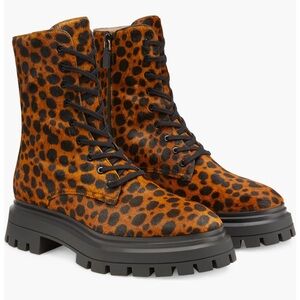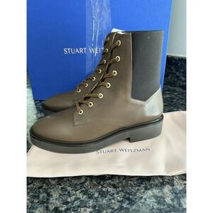 STUART WEITZMAN leather combat boots, brown, brass buckle/straps, lug sole. 7
