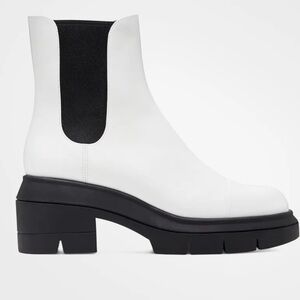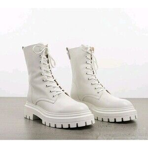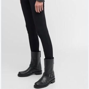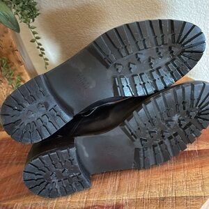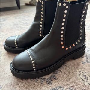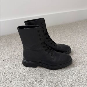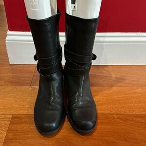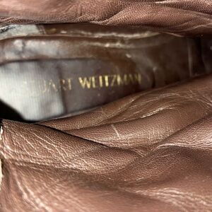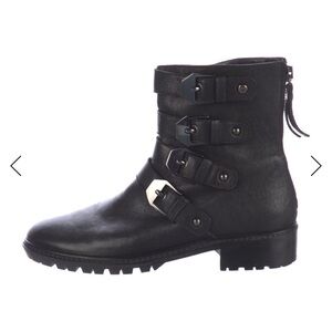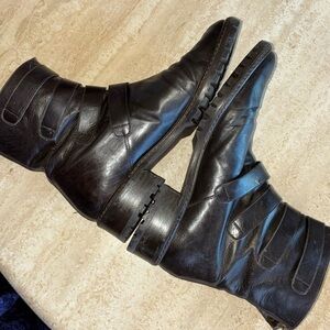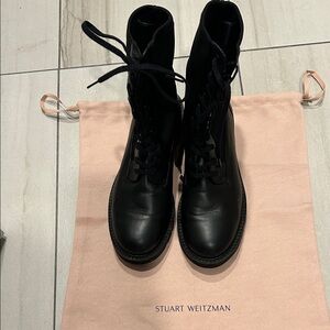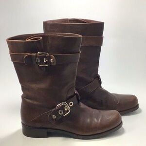 STUART WEITZMAN beautiful brown leather moto combat boots, 4 straps with brass buckles, back zipper. Lug sole. Wardrobe basic!