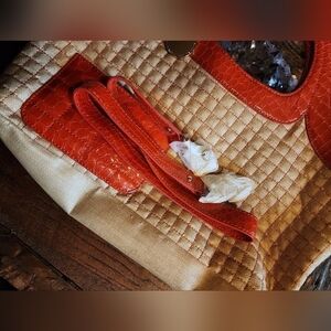 Perfect for spring and summer outings! The bag has multiple compartments on the inside with a center zip for your valuables accented with bright orange patent leather and gold hardware.
