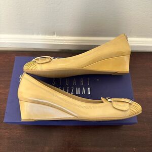 STUART WEITZMAN sz 7,5 Patent Leather Wedge Heels Front Buckle Scrunch Toe