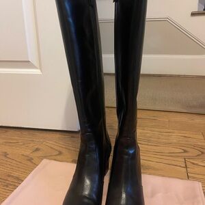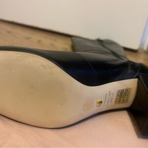 black calf leather almond toe side zip fastening branded leather insole leather lining mid block heel leather sole knee-high