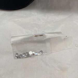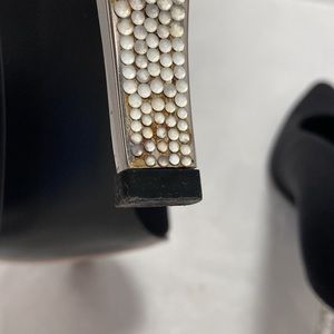 These gorgeous Stuart Weitzman pumps are made of satin. The wavy heel is made of silver tone metal, covered by sequins. Black heel tip for contrast. No scuffs or scratches to the shoe itself; minor wrinkling at vamp. The only issue I see is that the metal heel seems to have discolored. Can be remedied by removing sequins, painting heel and reapplying sequins. Well worth the work for a gorgeous and unusual shoe like this. Made in Spain. Size 8 1/2 B. Includes additional sequins. No original box but will include Beacon box as shown in photos.