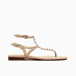 NWT. Flat leather sandals with studs. Front strap with toe-post and double strap at ankle with buckles.