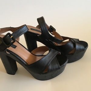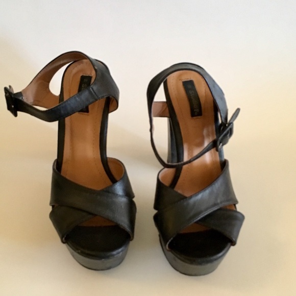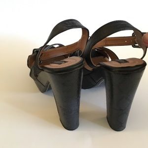 These beautiful imported from Colombia platforms by Studio F are in great condition, only worn a few times. Heel has black and grey snake print for a sexy unique look.