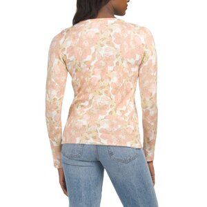 rhinestone buttons, floral pattern, ribbed knit collar, cuffs and hem, button down front, silver tone accents, printed design