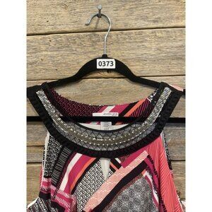 The Studio One New York Maxi Dress in size L is a stylish and versatile garment perfect for various occasions such as travel, weddings, parties, and even casual or formal events. The dress features a beautifully designed scoop neckline and a sleeveless fit & flare style, making it a flattering and elegant choice for women. With a colorful geometric pattern and beaded accents, this dress offers a unique and eye-catching look suitable for all seasons. Made from a blend of polyester and spandex, this lined and stretchy dress ensures a comfortable and flattering fit for any body type.