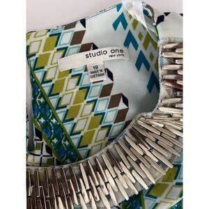 STUDIO ONE NY Shift Midi White Green Blue Sleeveless Embellished Neck Dress 18