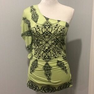 STUDIO Y Sexy One Shoulder Stretchy Ruched Top Chartreuse & Black S EUC