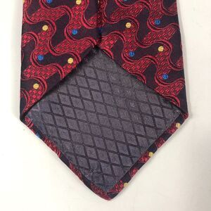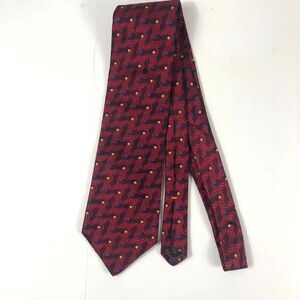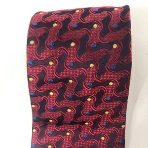 This is an elegant and eye-catching vintage necktie from STUDIO by Fumagalli's. The tie features a rich color palette of deep burgundy/red and navy blue, adorned with a dynamic, wavy, or paisley-like pattern in red, accented by scattered small blue and yellow polka-dots (or circles). 100% Imported Silk, Printed in Italy, Made in USA