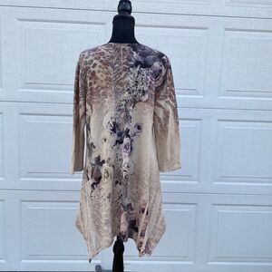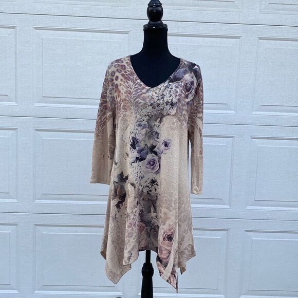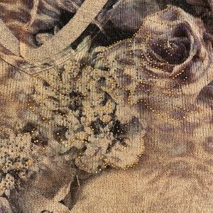 Multicolor V-neck oversize long sleeve blouse that look great with a pair of pants or leggings. Top left side of the blouse is enhanced with gold beadings.