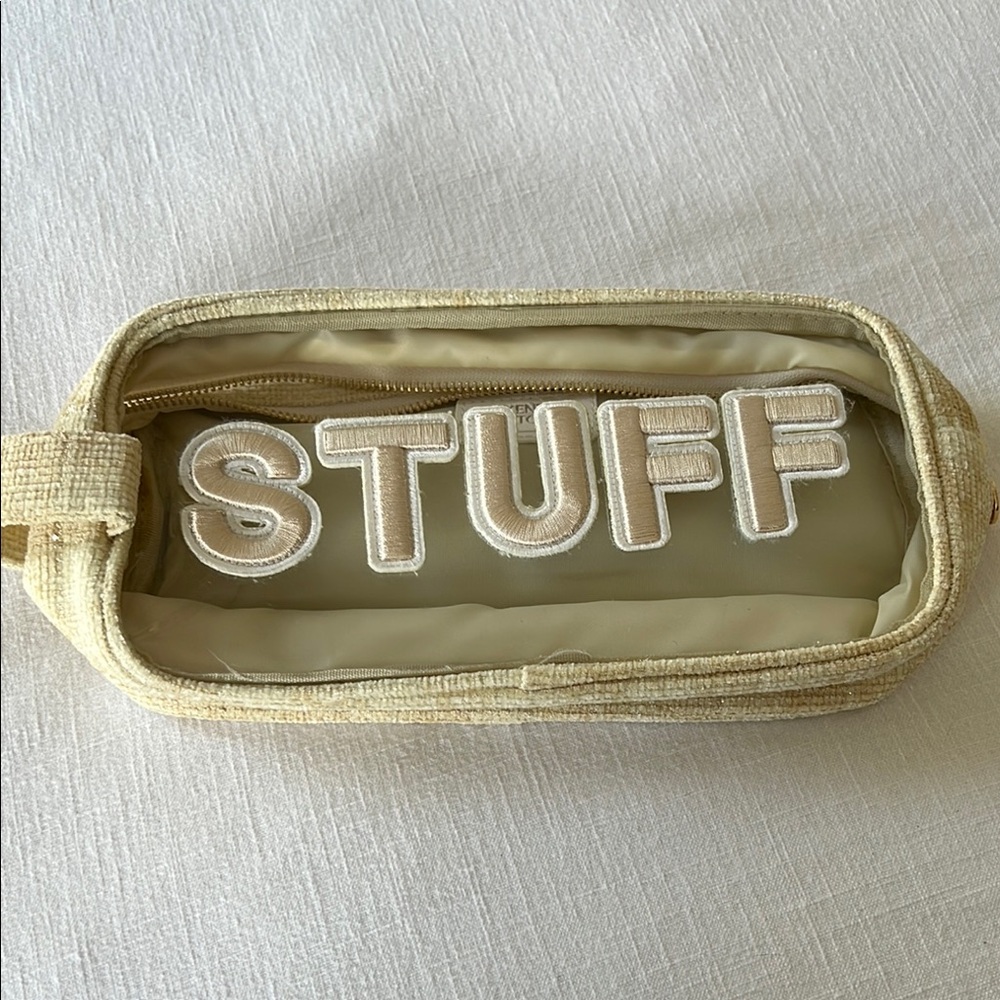 Stylish beige pouch with 'STUFF' embroidery. Perfect for organizing essentials.