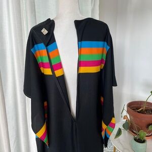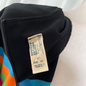 Black polyester knit with bold rainbow stripe panels in turquoise, yellow, red, and hot pink—an iconic California 70s color palette.