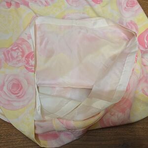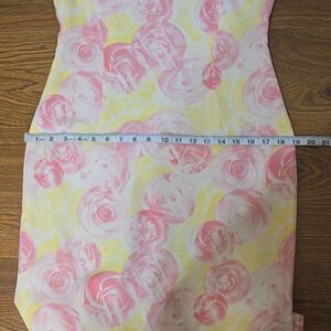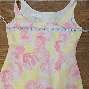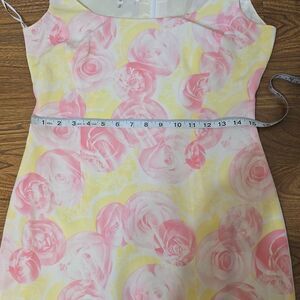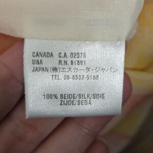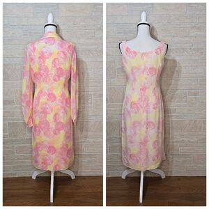 This dress is a stunner. 100% silk. Beautiful colors, but not garish. Very understated and classy. The dress is fully lined and has snap strap holders. The over shirt has 3 hook and eye closures at the waist and attached tie. It is lightweight and provides a lot of flowing movement. Like new condition with no issues. Size 38 converts to a Medium or US 8. Please see pics for approximate flat measurements to ensure proper fit. Yellow pink white
