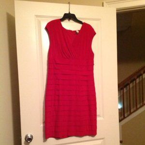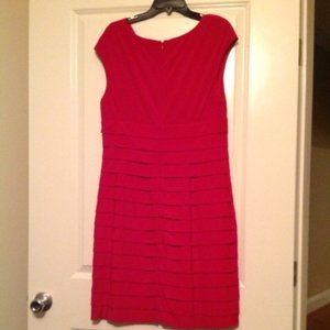 This sleeveless beauty is fire engine red and has ribbed horizontal layers from the waist down. The photo makes the dress look like a straight fitting dress, however it is slightly tapered from the waist down, to accentuate the waist line and create/enhance curves. The dress is quite comfortable and has an invisible zipper on the back of the dress. The dress stops right at or below the knee, depending on the height of your heels.