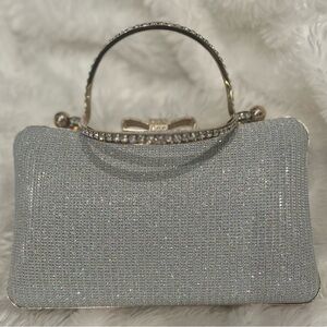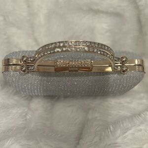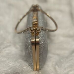 Silver glitter rhinestone clutch with gold accents. Detachable gold strap included.
