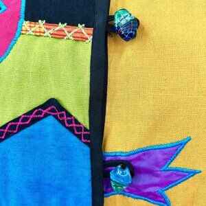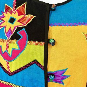 GORGEOUS vintage 1990's jacket from Julia Kim! Brightly colored and lightweight, this jacket features a vibrant patchwork design with embroidered accents. Colorful glass button closures add practicality and flair.