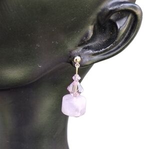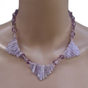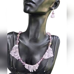 Elevate your style with this exquisite Amethyst and Glass Necklace and Earrings Set, a stunning blend of natural beauty and elegant craftsmanship. This set features a captivating necklace adorned with faceted purple glass beads and striking, elongated amethyst elements, creating a unique and eye-catching design. The matching pierced earrings echo the design with delicate drops, completing this harmonious ensemble. Necklace measures 17 inches in length with a box tab closure. Earrings are drop style with stud backs and measure just over an inch. Set is in exquisite condition