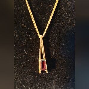Elevate your style with this STUNNING vintage modernist necklace, featuring a sleek geometric pendant design in a warm gold-tone setting. The centerpiece is a rich emerald-cut purple glass stone, securely prong-set in an elongated open-frame pendant that creates a striking, architectural look. Suspended from a classic gold-tone chain, this piece balances timeless elegance with a bold, minimalist edge. Perfect for both everyday sophistication and evening glamour.