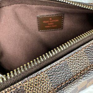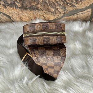 Crafted in the signature Damier Ebene canvas, the Louis Vuitton Geronimos Crossbody Bag is the ultimate fusion of luxury and functionality. Its compact silhouette, rich brown checkerboard pattern, and supple leather accents make it a timeless piece that easily complements both casual and upscale looks. Whether worn across the chest, over the shoulder, or around the waist, it brings sophisticated versatility to any outfit.