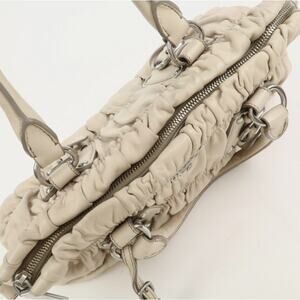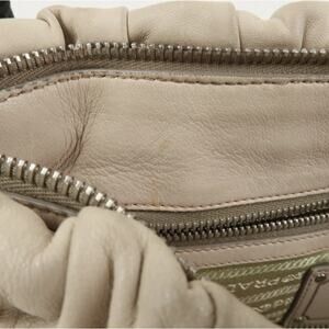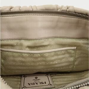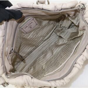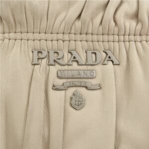 Elevate your style with this exquisite PRADA Nappa Leather Gathered 2Way Tote Shoulder Bag in a sophisticated beige. Crafted from luxurious nappa leather, this bag features a unique gathered design, adding a touch of elegance to your ensemble.
