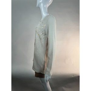 Celebrate the holiday season with STYLE & CO's Holiday Snow Globe Christmas Top in size M. This beige, cotton blend top, despite a minor blemish, adds a festive touch to your wardrobe. There are some pulls in the fabric - See photos for more details.