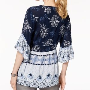 Gentle gathering creates a soft drape for this lovely peasant top from Style & Co. Highlighted with blue trim, this mixed print top is a splendid addition to your casual style.