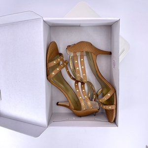 NEW IN BOX STYLE & COMPANY DRESSY 9.5M FAUX LEATHER LEVINE 3 INCH METALLIC CAMEL BROWN GOLD STUDDED STILETTOS
