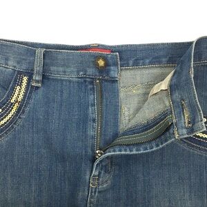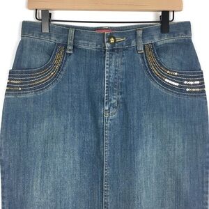 STYLE J Skirt Maxi Denim Long Gold Sequins Bling Size 28 / 8 Embroidered Modest Light Wash