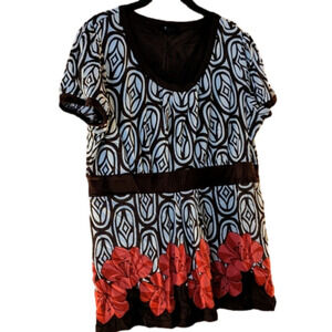 This listing is for a pre-owned Style & Co Blouse. It is brown, off white and a reddish pink color. It has geometric shapes and beautiful flowers on the bottom of the shirt. This shirt is 100% Nylon and lined. It has short sleeves and is a lighter weight shirt.
