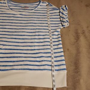 White sweatshirt with Blue stripes. Front pocket. Good condition. Perfect summer.