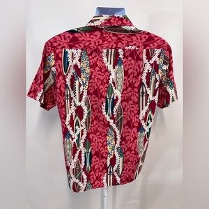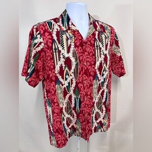 Red and cream Hawaiian shirt with Lei and surfboard motif from STYLED BY RJC, Size M. Shirt is short sleeves with front button closure.