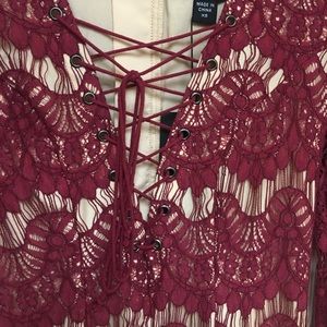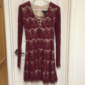 Gorgeous dark red lace dress with a nylon/cotton blend nude lining underneath. In perfect condition. This dress is SO flattering on, it is just slightly too long on me (I’m 5’ tall and it lands a little above my knee and I prefer short dresses to be more mid thigh on me).